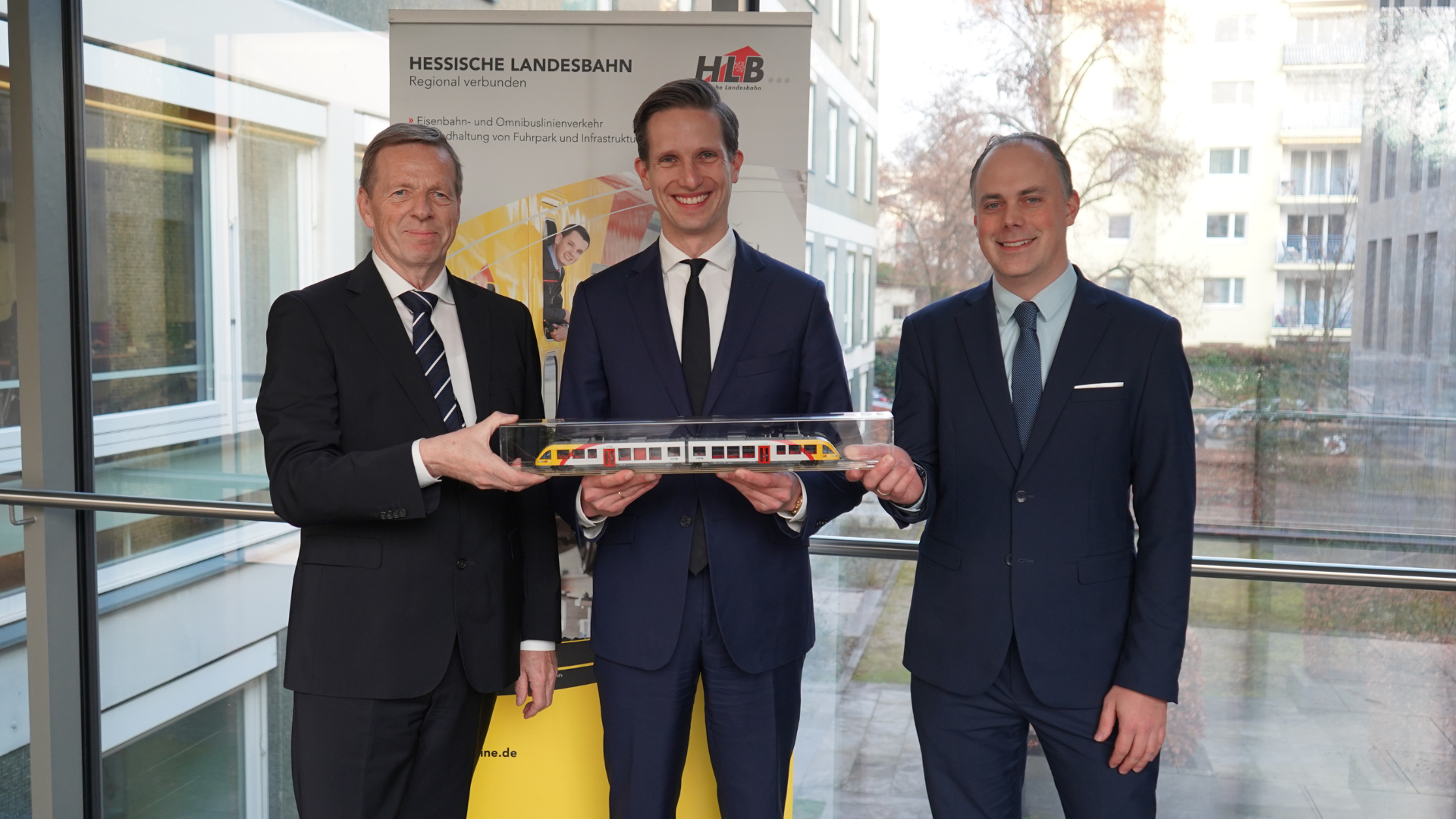(Foto v.l.n.r.: Veit Salzmann, Geschäftsführer der Hessischen Landesbahn GmbH (Sprecher); Finanzstaatssekretär Dr. Till Kaesbach; Tobias Beckers, Technischer Geschäftsführer der Hessischen Landesbahn GmbH